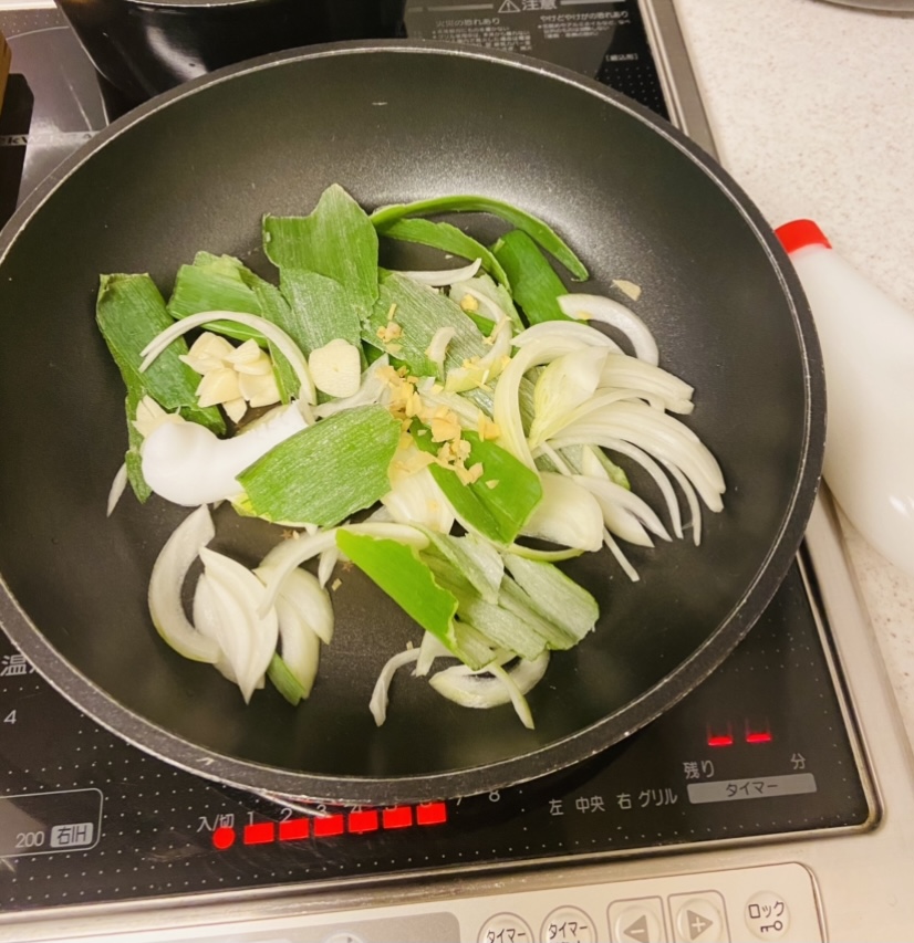 ニンニク切れ端・長ネギの青い部分・玉ねぎ少しを、油でゆっくり加熱します。