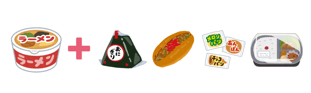 カップ麺(炭水化物)×炭水化物の組み合わせです。具体的には米飯(おにぎり、お弁当)、パンなどです。炭水化物(パンやお弁当では脂質も)の過剰摂取となり血糖値が上がりやすく、体脂肪が蓄積しやすい組み合わせです。
