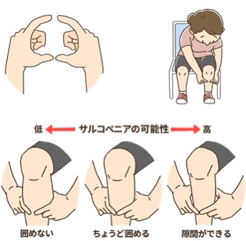 指とふくらはぎの間に隙間ができる方サルコペニアの可能性があります。食事運動でしっかり対策をしていきましょう。