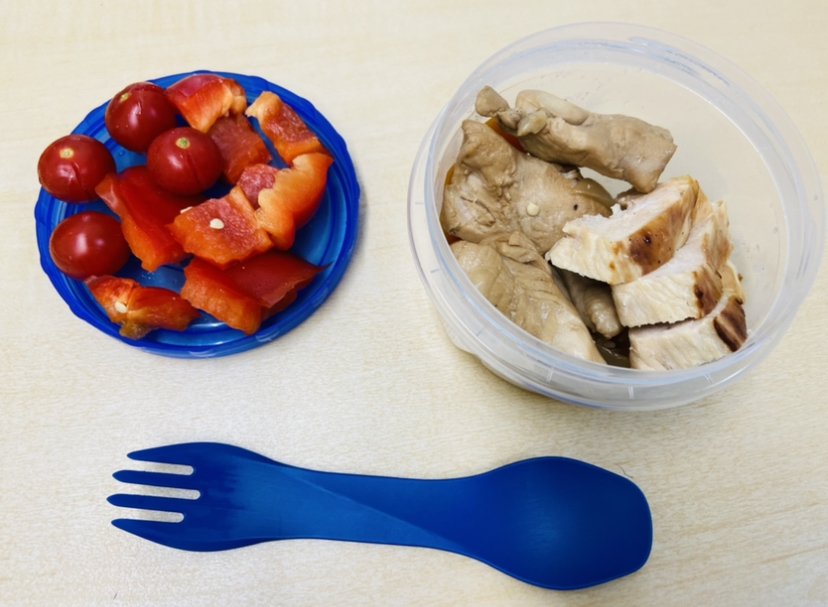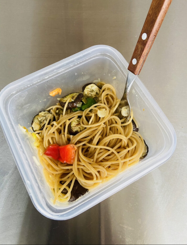 ※パスタは冷蔵庫内で水に浸しておきます。タッパーに食材を全部入れて、レンジでチンしてオリーブオイルと塩胡椒するだけです、簡単。