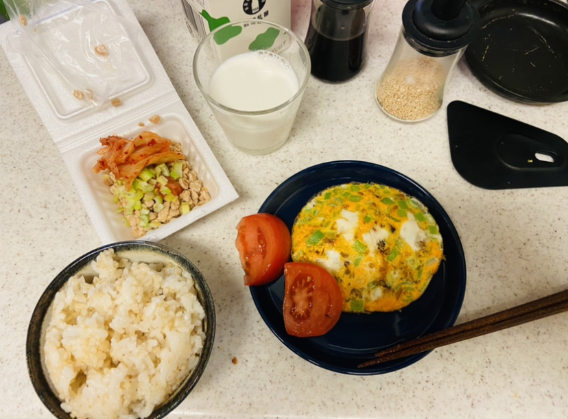 玄米ご飯(茶碗1杯)、卵焼き(ネギ、ゴマ入り)、トマト、納豆(キムチ入り)、牛乳