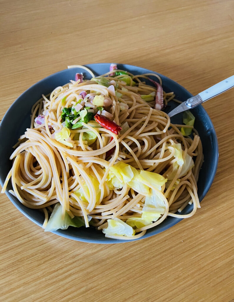 意識したこと:炭水化物は白より茶色(全粒粉パスタ)、パスタの量に注意、塩分(アンチョビ)を入れすぎないように注意(減塩)