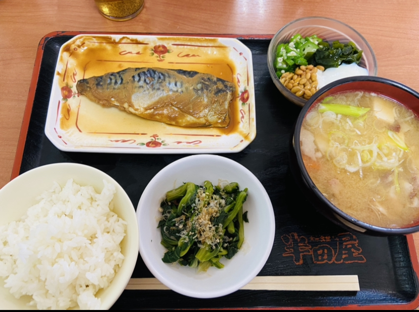 白米130g、豚汁、サバの味噌煮、ネバネバ(温泉卵、ワカメ、オクラ、納豆)、ホウレンソウのおひたし