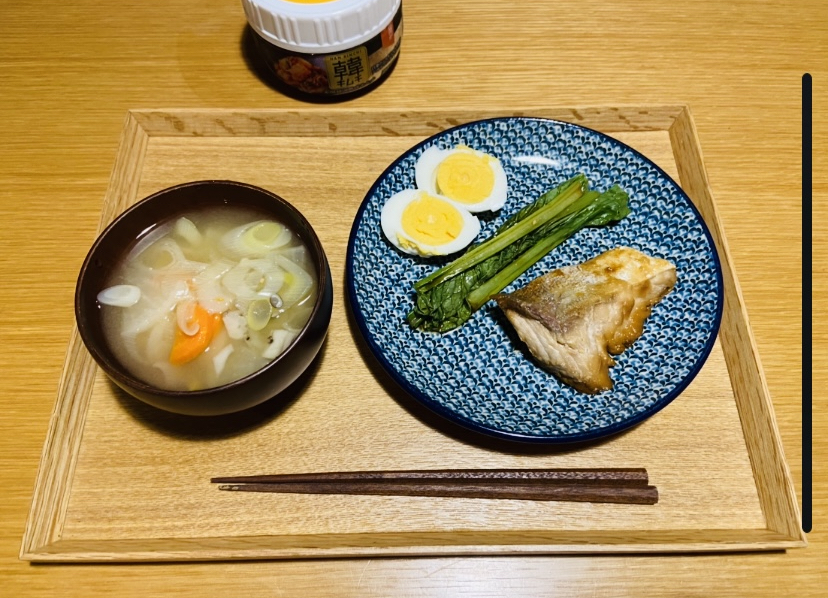 豚汁とブリの照り焼き、小松菜、ゆで卵、キムチ
