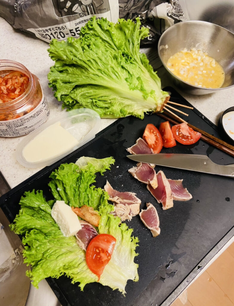 カツオのタタキ、豆腐、トマト、キムチ、患者さんから頂いたレタスに巻いて