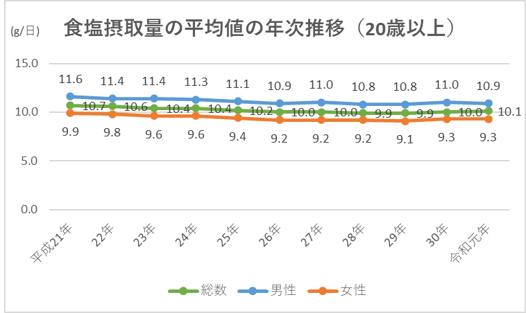 令和元年の「国民健康・栄養調査」(厚生労働省)の結果では、塩分摂取量の平均は男性10.9g、女性9.3gであり年々減少傾向ではありますが、まだまだ適切な塩分量よりも多く摂取しているのが現状です。