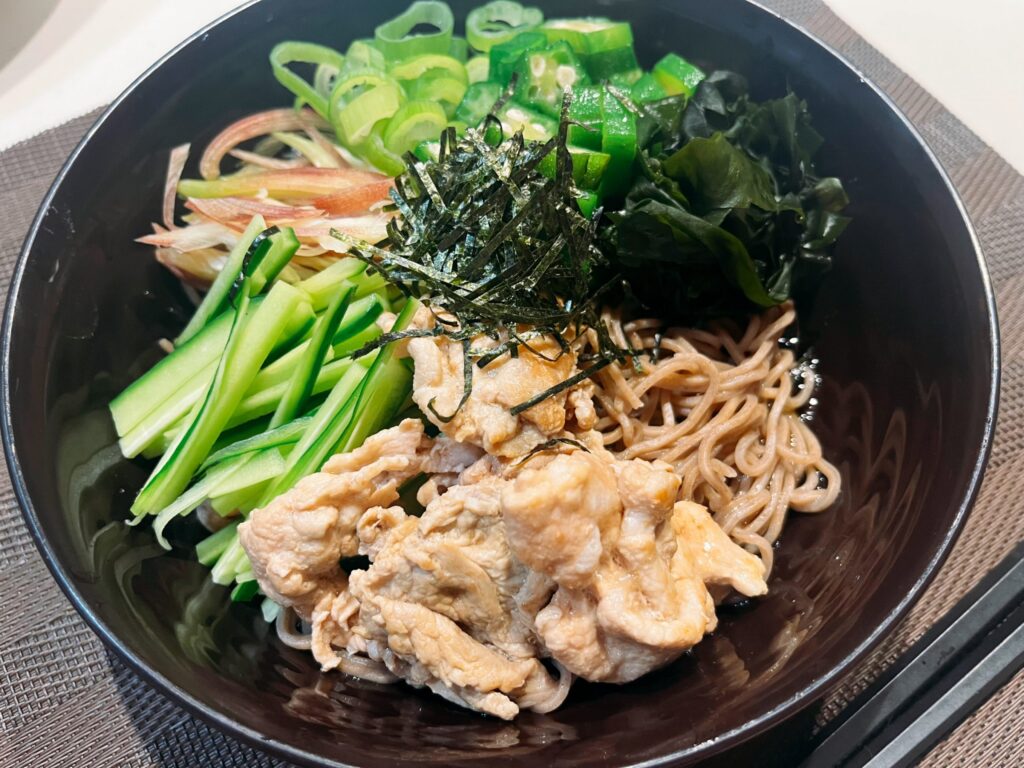 たんぱく源として豚こま肉を冷しゃぶ風にしてトッピングしていますが、ゆで卵や納豆に置き換えてもOKです