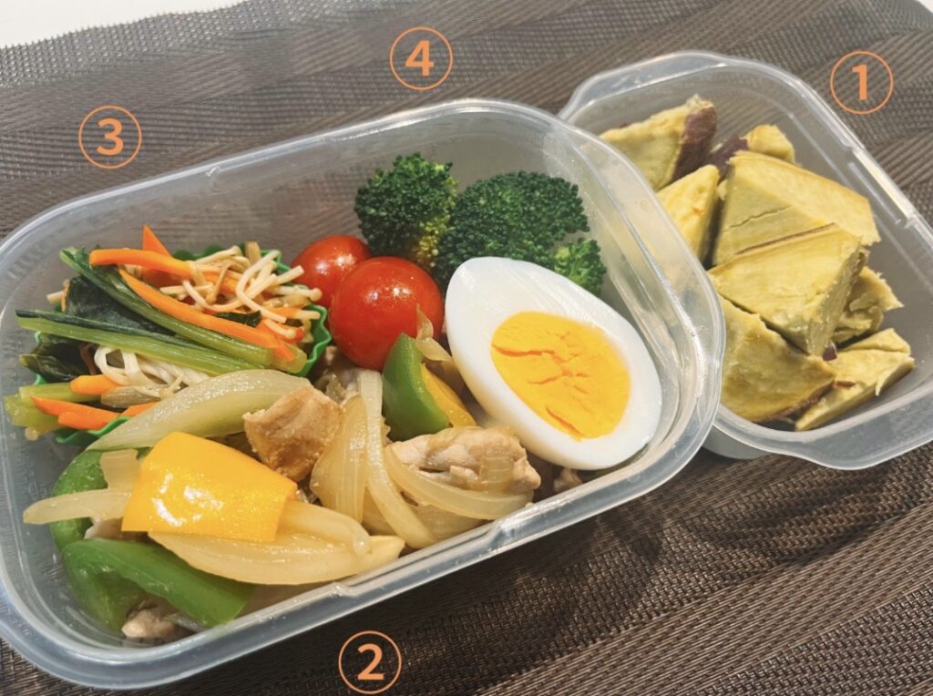 ④付け合わせのミニトマト、ブロッコリー、茹で卵1/2(彩りがきれいなのでお弁当の定番です)