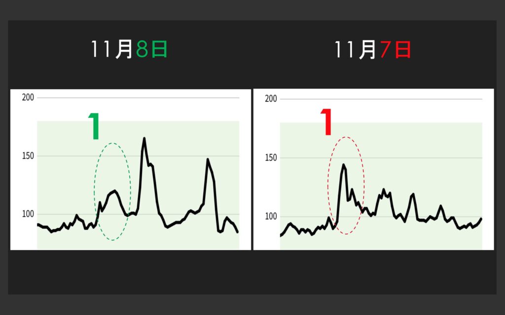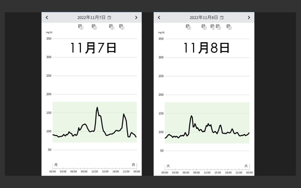 これは11月7日と11月8日の24時間のCGMの結果、縦軸はグルコース値、横軸は時間です。